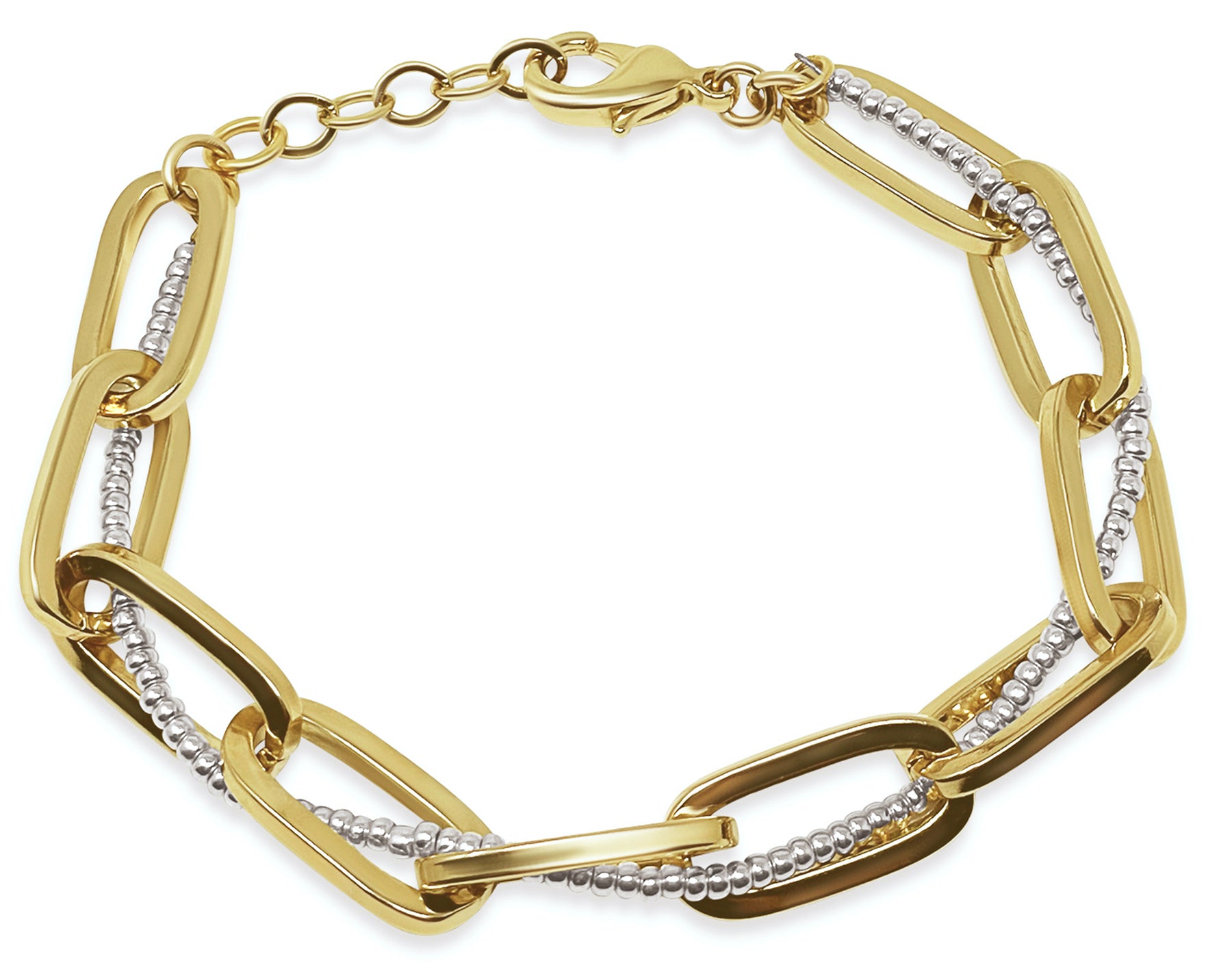 Bold oval links of gold Italian Brass are woven with silver beads, creating a light catching mix of texture and style. This interwoven mix stand out will become your coveted piece for day and night.